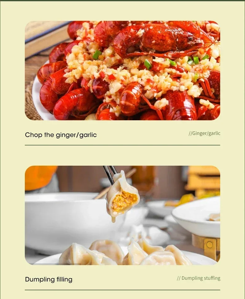 Use for:Garlic/ginger/chilli/meat/grinding/complementary foods