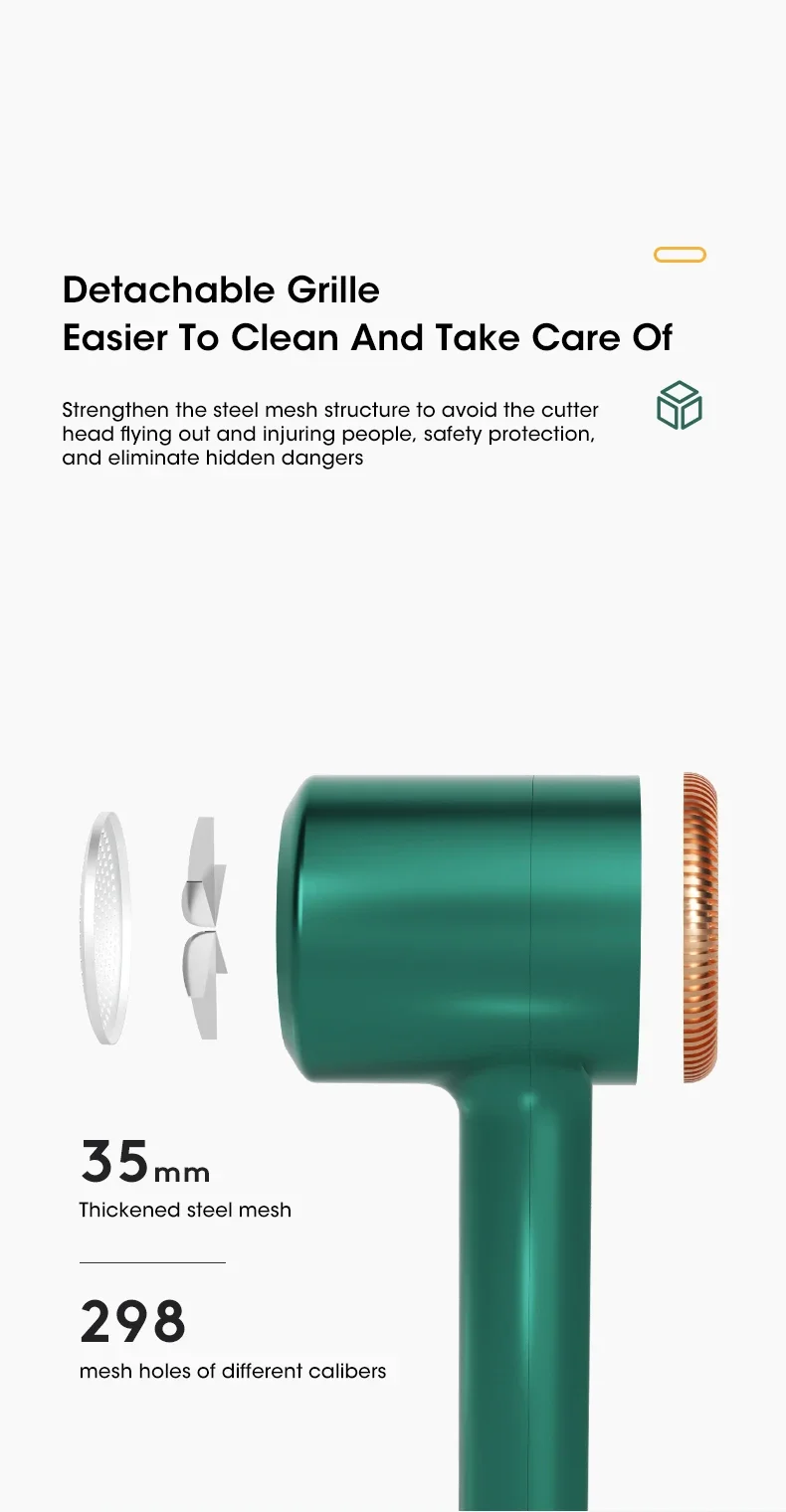 4. 35mm thick stainless steel mesh surface, 298 mesh holes of different calibers, detachable mesh cover, safer to use, and more efficient to remove hair balls.